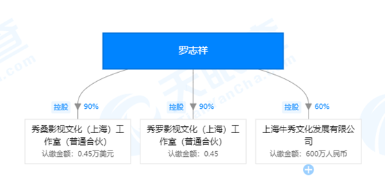 个人公司方面据天眼查显示,罗志祥旗下有5家企业,直接投资企业为秀罗影视文化(上海)工作室(普通合伙)、 秀桑影视文化(上海)工作室(普通合伙)、上海牛秀文化发展有限公司(简称牛秀文化),分别持股90%、90%和60%,处于绝对控制地位,不过这三家中,罗志祥本人并不是法定代表人或董事长。