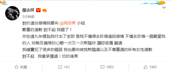 在周扬青昨日(4月23日)发布分手信后,罗志祥曾回应过一次,当时罗志祥在回应中并没有承认分手信中的爆料,只是称有些事说不清楚。