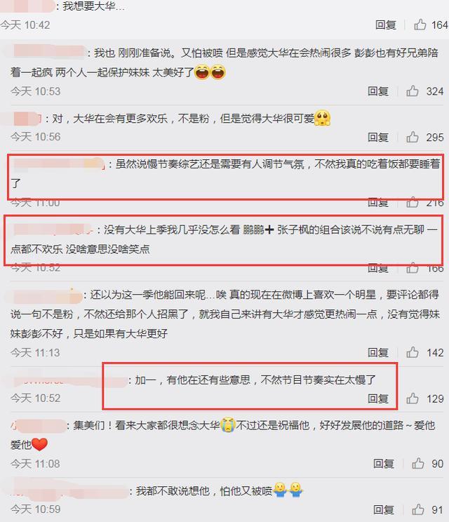 《向往的生活》系列综艺,刚开播的时候是黄磊、何炅、刘宪华的三人组合,在第三季将刘宪华换掉,变成了彭昱畅和张子枫的兄妹组合常驻。何炅和黄磊担任的角色不变,两个成熟稳重的长辈,但彭昱畅和张子枫的常驻却引起了不小的争议。虽然是慢综艺,但仍有网友吐槽,即使是慢综艺,但未免也太没看点了些,更是将矛头对准彭昱畅,张子枫,表示这两个人实在太无聊了。