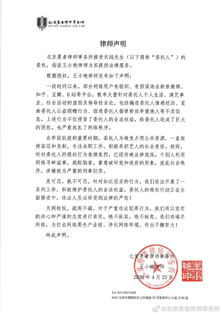 新京报讯 4月23日,肖战工作室微博转发了北京勇者律师事务所的律师声明,声明中称该律所已接受肖战的委托为其提供法律服务。声明中写道,一段时间以来,部分网络用户有组织、有预谋地在社交媒体平台,散播大量针对委托人个人生活、演艺事业、社会活动的虚假及侮辱性言论,包括编造委托人情感经历、歪曲委托人公益捐赠行为、捏造委托人指使粉丝举报他人等不实信息。