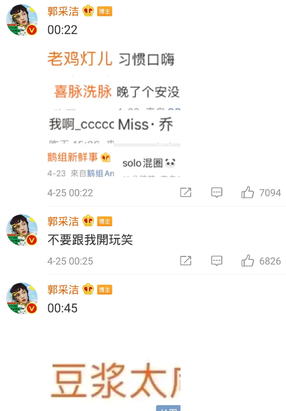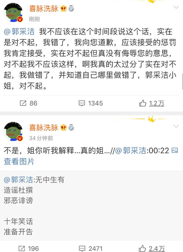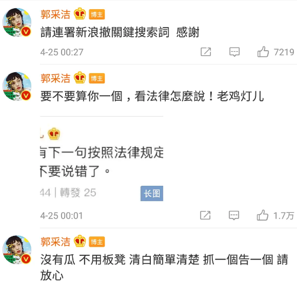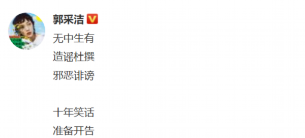 4月24日,郭采洁在发文辟谣维权:无中生有 造谣杜撰 邪恶诽谤 十年笑话 准备开告。