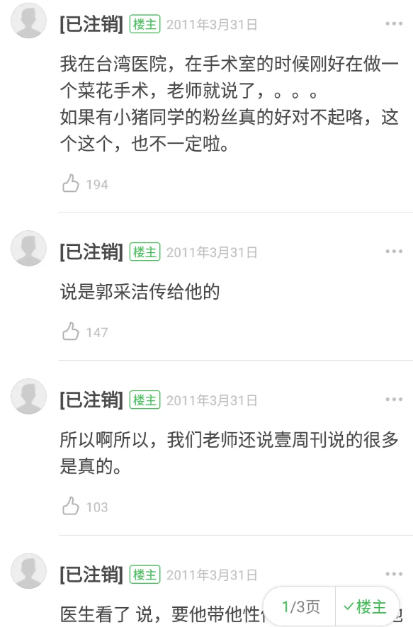 在2011年有一位自称是台湾当医学实习生在论坛爆料表示,罗志祥现身医院做男女方面的传染病,还表示传染病是被郭采洁传染的。更恶心的是,这位报料人称郭采洁在读大学期间就十分不检点,传染病都已经长到了嘴上。
