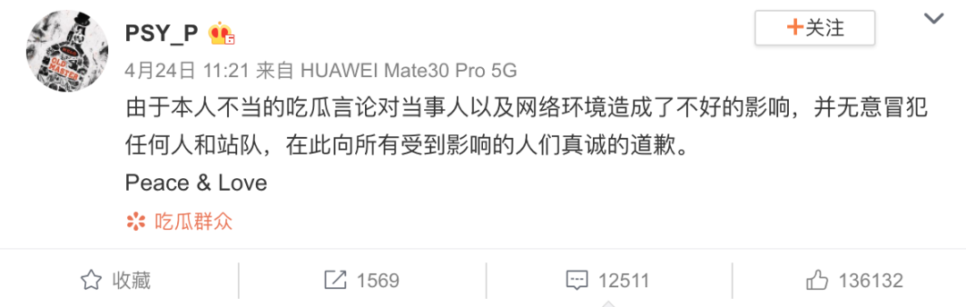被骂上热搜后,色痞发了条微博道歉。 作为公众人物,第一准则即谨言慎行,不是万事万物一句“PeaceLove”就能搪塞,比起“所有受到影响的人们”,他的道歉对象更应该是周扬青。