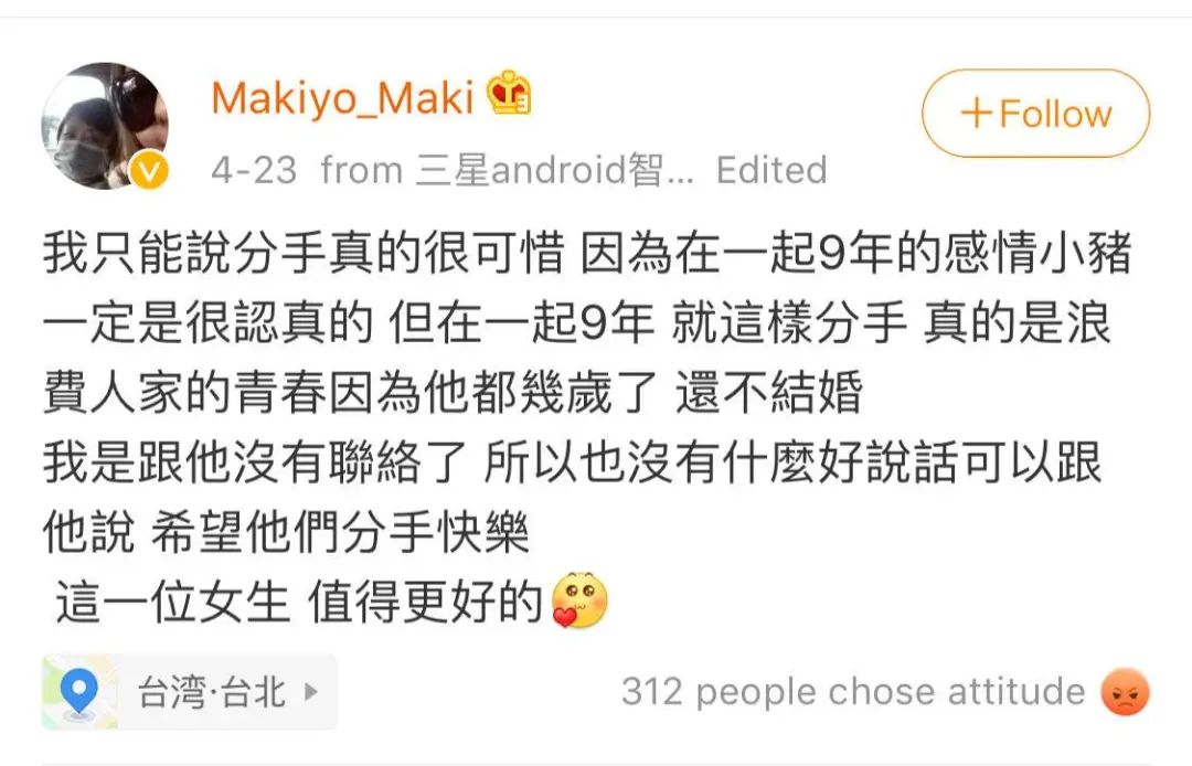 23日Makiyo发文,指罗志祥和周扬青谈了9年恋爱还不结婚,浪费人家的青春,并祝二人分手快乐。