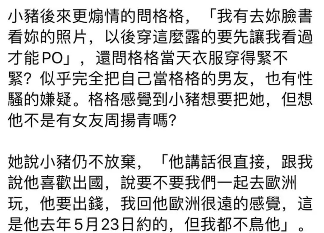 写真女星格格(吕亚晞)则在24日晒出聊天记录,内容暧昧,尺度也很大。