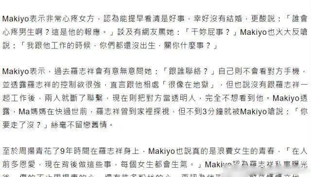 提到跟罗志祥相处的日子时,Makiyo称对方控制欲很强,总是看她的手机,形容和他相处像地狱。