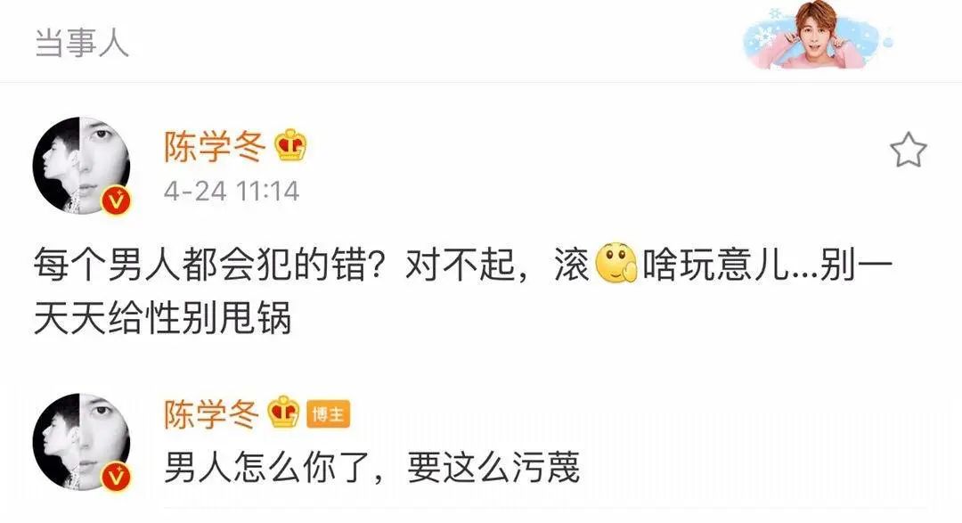 而陈学冬吃瓜の一天更是繁忙,先是 怼色痞“别一天天给性别甩锅” ↓