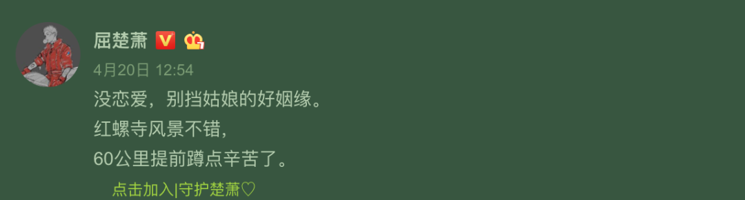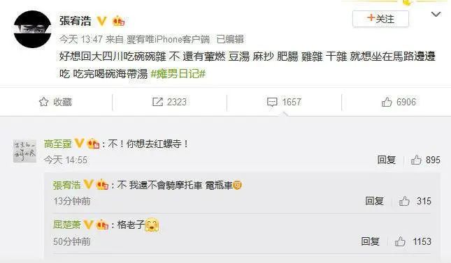 还有屈楚萧在内四人自封的“中戏F4”,被拍当天张宥浩发了条微博(已删除),高至霆则在底下拿“红螺寺”“摩托车”玩梗。