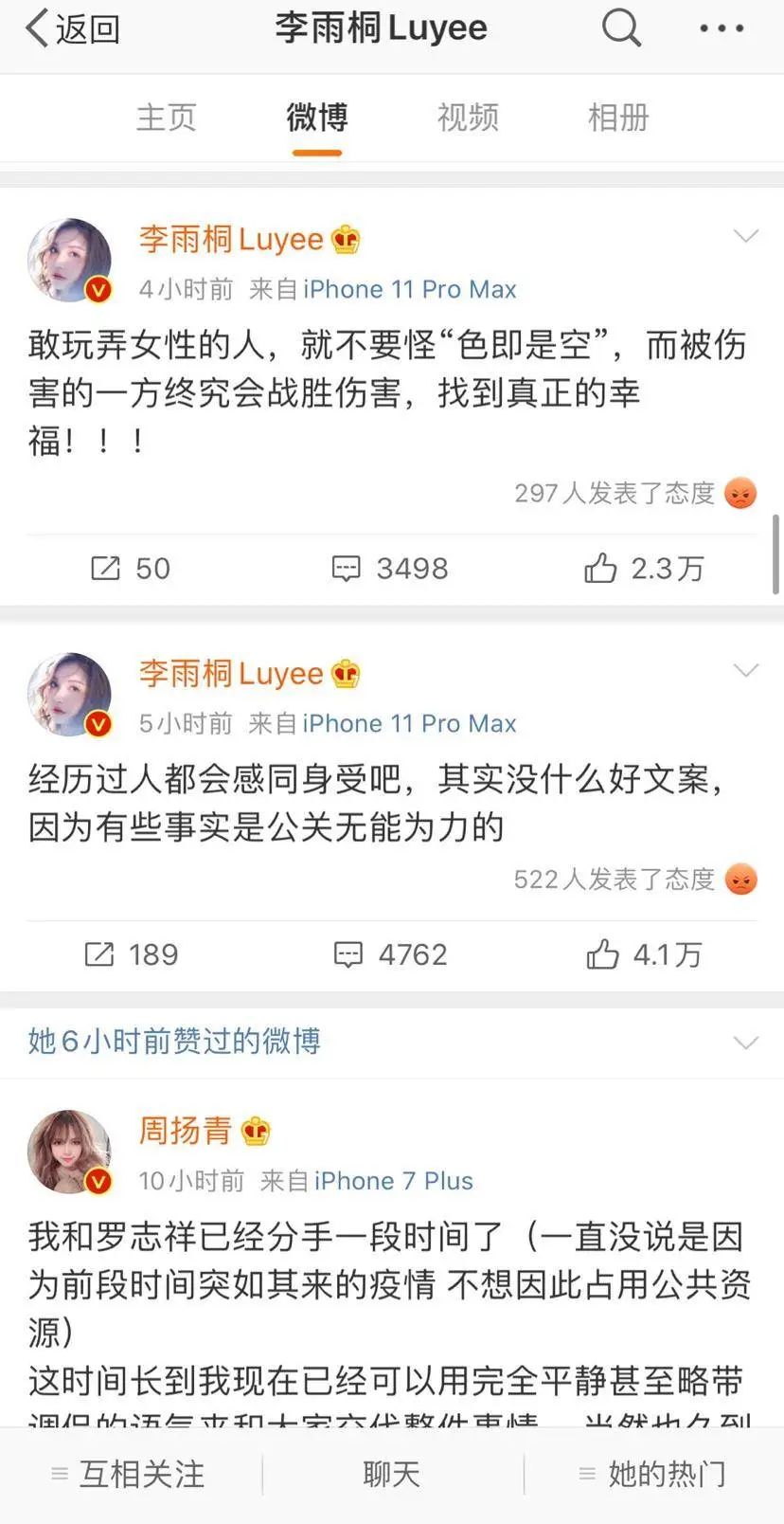 周扬青的爆料似乎给众多女艺人带来了鼓舞,要么跟着metoo, 爆料渣男前男友;要么就此表达自己的看法,共情、安慰、吐槽,各式各样,矛头直指渣男团。