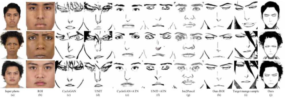 接下来是跨域转换层面中 MangaGAN 与其他方法的对比。为公平起见,CycleGAN 和 UNIT 先转换全脸再转换每个人脸特征。最终效果如下图所示: