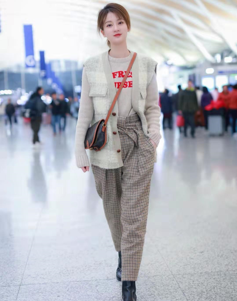 这一套穿的把我惊艳到了。打破了平时乔欣乖乖女的形象。原来淑女风的乔欣也可以这么帅。只见她上衣穿了一件红色格子的短款西装,里面内搭一件丝绸面料的衬衫,仔细一看衬衫里面还叠穿了一件高领同色系线衫,搭配的好有心机哦,这也太会搭了吧。下身是一件修身黑色裤子,鞋子是一双尖头中筒靴。这一套穿上也太酷了吧。她的搭配真的是可甜可咸,什么风格都能驾驭,属实羡慕哦。