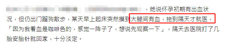 周采诗说自己怀孕初期有出血状况,但依旧出门遛狗散步。某天周采诗起床发现腿间有血,但因为血迹已经呈褐色了,所以她打算观察一段时间,心大拖到隔天才去医院打了几针安胎针。