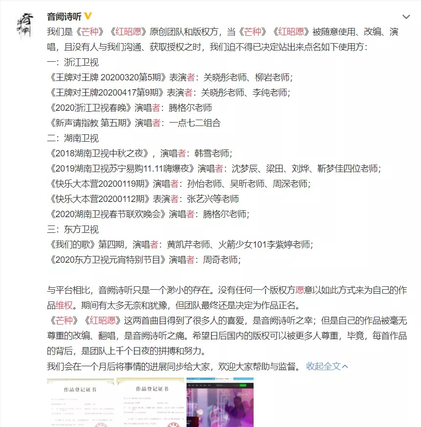 网络红曲《红昭愿》《芒种》的原创团队及版权方音阙诗听在线维权,他们发微博称称歌曲被多档节目改编、演唱,未经过自己同意和授权,并列出了节目名单和作品登记证书,“希望日后国内的版权可以被更多人尊重,毕竟每首作品的背后,是团队上千个日夜的拼搏和努力。”事实上,网络维权屡见不鲜,但收效甚微。