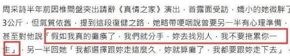 四处找医生做治疗的那段漫长的岁月中,周采诗甚至想要放弃自己明星的愿望。而且特别担心自己的身体健康,还特别绝望啊,和自己的老公说,假如我真的谈话了我们就分手去找别人我不要脱离医生而老公做得十分大方的人表示自己依然会和他一起走下去,这真的令人很感动,