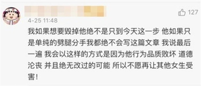 周扬青在回复此网友时表示:我如果想要毁掉他绝不是只到今天这一步,他如果只是单纯地劈腿分手我绝不会写这篇文章,我会以这样的方式是因为他行为品质败坏,且绝无改过的可能,所以不愿再让其他女生受害。