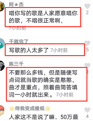 对此,有网友留言“唱你写的歌是人家愿意唱你的歌,不唱很正常啊”“写歌的人太多了”“不要那么多钱,但是随便写点词就当歌的确实是憨憨,曲才是重点,照着曲简答填词一小时就出来了”。