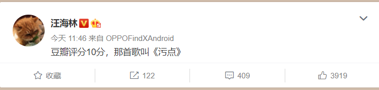 对于这点争议,汪海林又抓住了,他发文表示讽刺到:“豆瓣评分10分,那首歌叫《污点》 ”