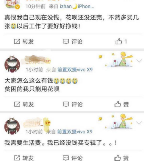 但极端的导向会让一些没有收入能力的未成年人或者学生党感到压力,既想给偶像支持,但又没有足够多的钱,所以就有网友声称,要用花呗来买单。