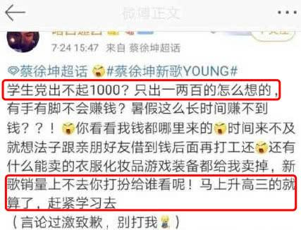 粉丝间的“攀比”不是第一次发生。2019年蔡徐坤发布新专辑《YOUNG》,上线3分钟左右销售额就达到了2000万元,但在专辑发布前,就有网友爆料,有粉丝在超话中喊话,每个粉丝被要求买200张专辑,一张5元,也就是最低消费1000元。这件事情也曾引发网友的关注和指责。
