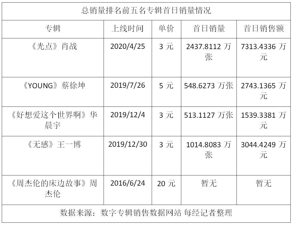 值得注意的是,《光点》目前已刷新专辑销量纪录。每日经济新闻记者统计,无论是专辑销量还是销售额,《光点》都已位列乐坛历史第一。排名第二的是蔡徐坤于2019年7月26日发行的《YOUNG》,上线平台也为QQ音乐、酷狗音乐和酷我音乐,总销量为1335万张,销售额为6674万元。排名第三至第五的分别为华晨宇的《好想爱这个世界啊》、王一博的《无感》和周杰伦的《周杰伦的床边故事》,销售额分别达到了6397万元、4769万元和3962万元。
