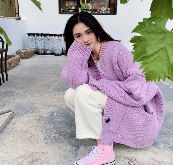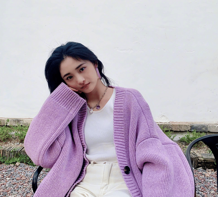 不得不说周洁琼的衣品还是很在线的,对比杨幂的衣品丝毫不会输,今年流行色是紫色,很多的明星都穿上了紫色,追求时尚的周洁琼当然也要试试紫色了,紫色的针织开衫也是今年很火很热的单品,周洁琼选择了一件香芋紫色的廓形针织开衫,打造出时髦的慵懒风。