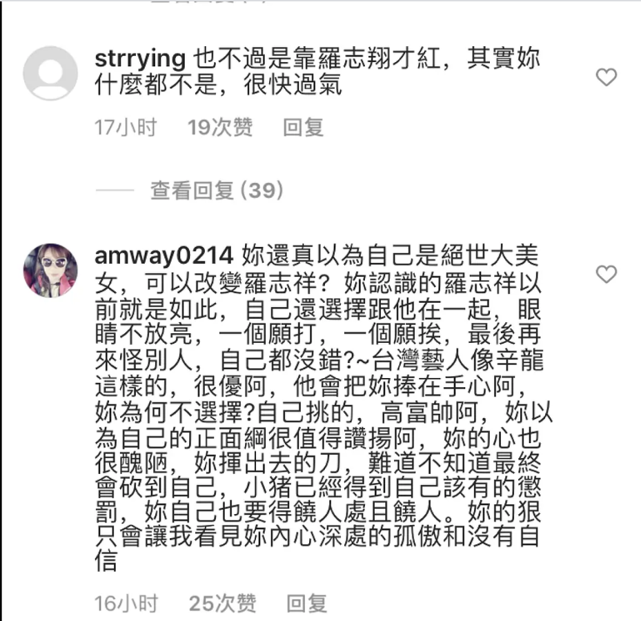 然而,周扬青在锤罗志祥后,不少台湾网民对其的评价却十分不堪,很多声音是选择力挺罗志祥的,认为罗志祥并没有做错什么。