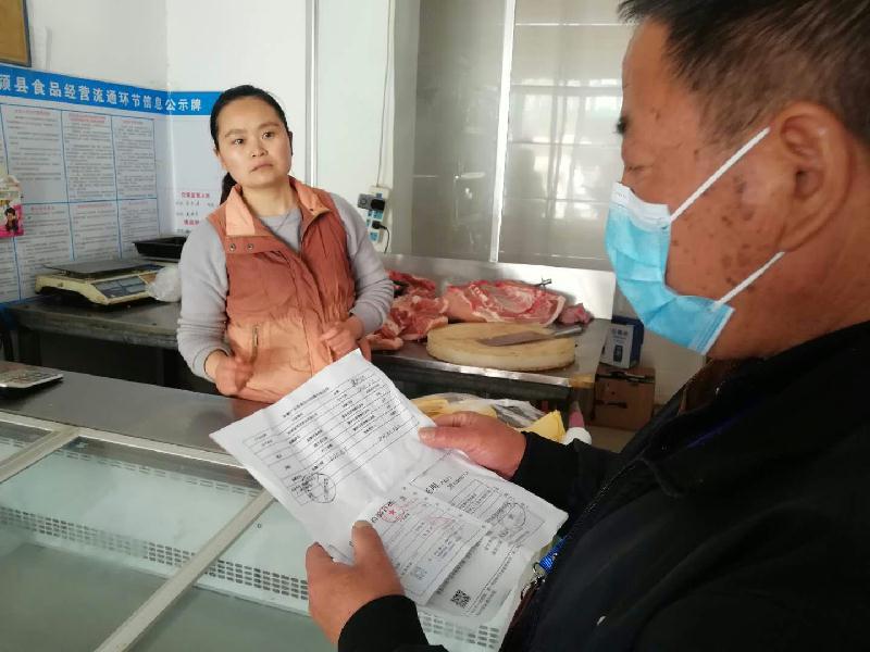 临颍县市场监管局执法人员主要围绕辖区农(集)贸市场、商场超市、餐饮服务单位、农村集市等重点场所开展检查。一是重点检查猪肉等生猪产品进货查验情况,通过逐户发放《市场销售猪肉等猪产品进货查验操作指南》,督促指导其按照要求严格规范落实进货查验主体责任,建立食品进货查验档案,保存时间不少于进货之日起6个月,确保来源可追溯。二是重点检查采购的猪肉等生猪产品是否具有动物检疫合格证明、肉品品质检验合格证明、非洲猪瘟病毒检测报告(简称两证一报告)原件或复印件,并加盖供货商原印章,不能提供动两证一报告的一律不得采购。三是重点检查采购的猪肉等生猪产品是否开具《食用动物和动物产品批发销售凭证》,填写内容是否规范齐全,填写数量是否与实际采购生猪产品一致,是否加盖供货商原印章,不能开具《食用动物和动物产品批发销售凭证》或相关信息填写不全面、不规范的一律不得采购。