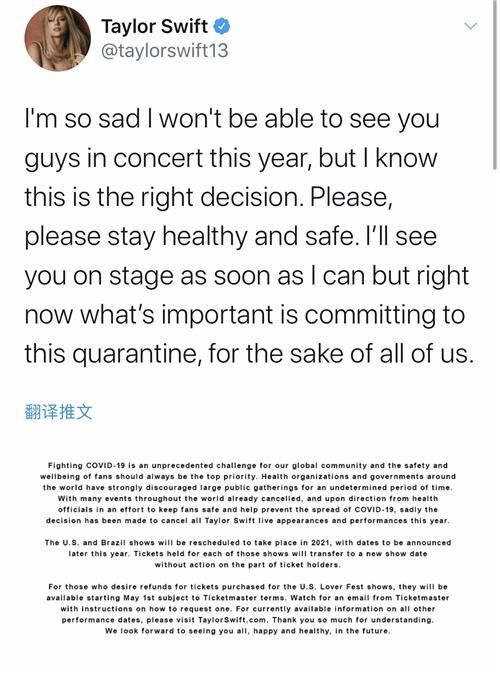 近日,歌手“霉霉”泰勒·斯威夫特在个人社交媒体上发布消息称将取消2020年的巡回演唱会,官方声明表示:“与新冠肺炎作战是一个前所未有的挑战,歌迷的安全应该是重中之重,为了保护粉丝的安全并防止新冠肺炎的传播,非常遗憾地决定取消泰勒·斯威夫特今年的所有现场演出。美国和巴西的演出将重新安排在2021年举行,日期将在今年晚些时候宣布。”据了解,退票工作将于5月1日展开。