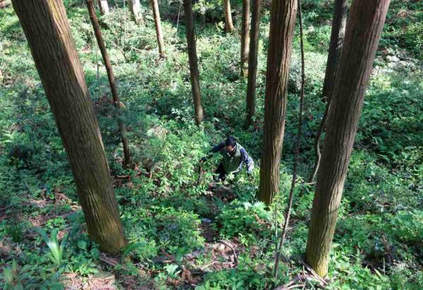 4月28日,在张家界武陵源景区鹞子寨,聂景明在丛林中巡查。