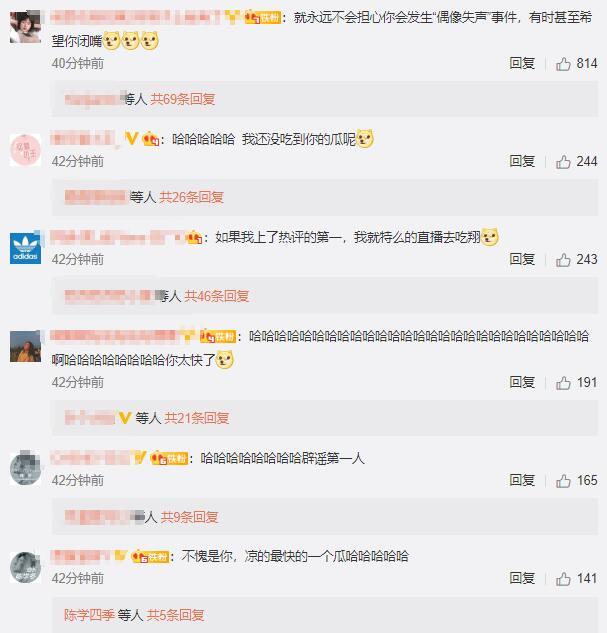 对此,粉丝们纷纷笑喷调侃道“就永远不会担心你会发生“偶像失声”事件,有时甚至希望你闭嘴”“哈哈哈哈哈 我还没吃到你的瓜呢”“哈哈哈你太快了”“辟谣第一人”“不愧是你,凉的最快的一个瓜哈哈哈哈哈”。