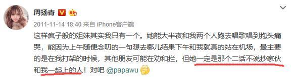 至于周扬青跟吴雨晴关系有多么的铁,周扬青曾在九年前微博上写过这么一段话,“她一定是那个二话不说抄家伙和我一起上的人。”不难看出,周扬青和闺蜜关系是真的好,完全是那种能够豁出性命,都要力挺彼此的好闺蜜。