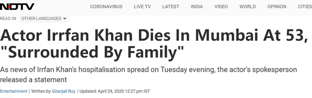 据海外网援引BBC、印度电视台等29日报道,印度著名演员伊尔凡可汗29日因病在孟买的一家医院去世,终年53岁。