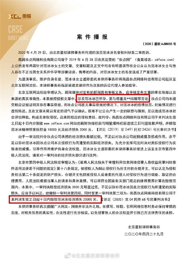 但是范冰冰最近也传出了好消息,4月29日,范冰冰律师事务所发文,表示范冰冰名誉权案二审再次胜诉,被告还需要追加赔偿给范冰冰,范冰冰名誉受到伤害也得到补偿。