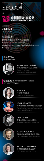 论坛将邀请《华丽志》编辑主任,时尚总监Elisa王琼、复旦大学卢晓国际精品品牌战略研究院特邀研究员,前任路威铭轩,开云,银泰,陆逊梯卡集团资深副总裁-- Joyce Deng、时堂创始人--林剑、寺库集团赋能生态云CEO杨静怡、寺库品牌和国际公关副总裁Regina Szeto,共同探讨时尚新生态下的机遇与挑战。各方观点的激烈碰撞定能探索出一条新环境下时尚行业的体验重构之道。