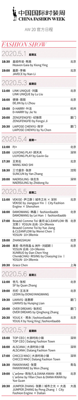 中国国际时装周始终致力于推动原创设计师品牌的发展与成长。5月1日—5月7日期间,每天有国内外知名设计师带来的共29场时尚大秀, ZHANGSHUAI、盖娅传说熊英、乐町•王冻洋等知名原创品牌将带来2020秋冬新品首秀,更有设计师亲临现场解读设计灵感,明星加盟助阵时装新品发布。寺库将全程直播秀场动态,解读流行趋势,为用户带来一手潮流资讯。