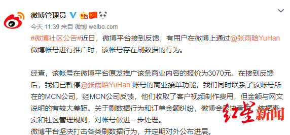 今天(10月17日)早晨11点,@微博管理员 发布公告,称微博平台接到反馈,有用户在微博上通过@张雨晗YuHan 微博帐号进行推广时,该帐号存在刷数据的行为。经查,该帐号在微博平台原发推广该条商业内容的报价为3070元。在接到反馈后,我们已暂停@张雨晗YuHan 账号的商业接单功能。