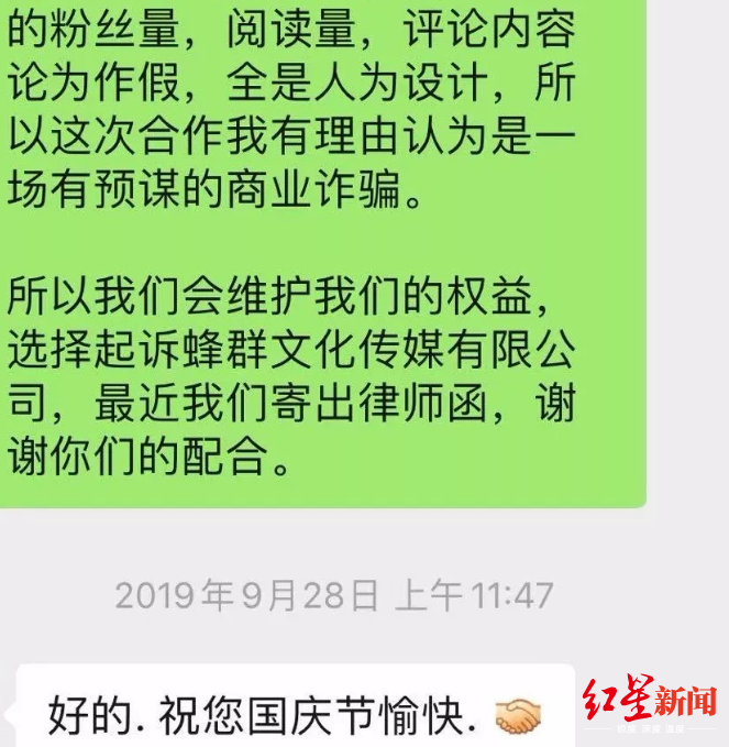 10月17日下午,粤苏公司对红星新闻表示,“蜂群文化”声明有关没有流量的表述是偷换概念,并且对爆料文章中所有数据的真实性负责,并称目前双方还在协商中。