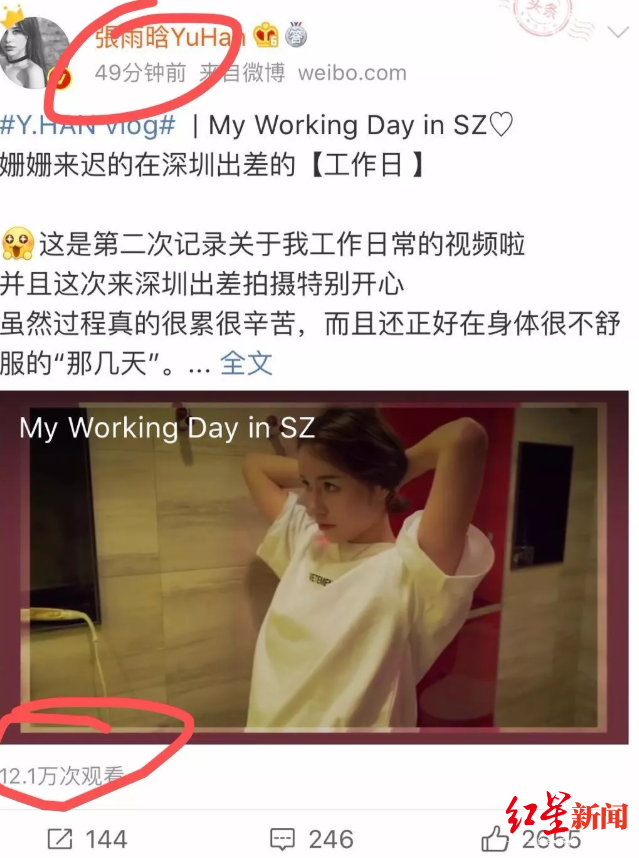 作者称,两小时为止,推广视频产生几十万的观看量,给公司带来的结果居然是0流量。第二天下午,当作者再次打开博主张雨晗微博,推广视频播放量截至13:34,已达到353万。