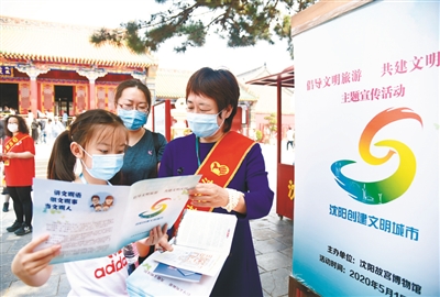 请问你有需要我帮助的吗?不远,有几位肩挎红色佩带的沈阳故宫志愿者,正在为游客发放《倡导文明旅游共建文明沈阳》《文明旅游乐行故宫》宣传册。