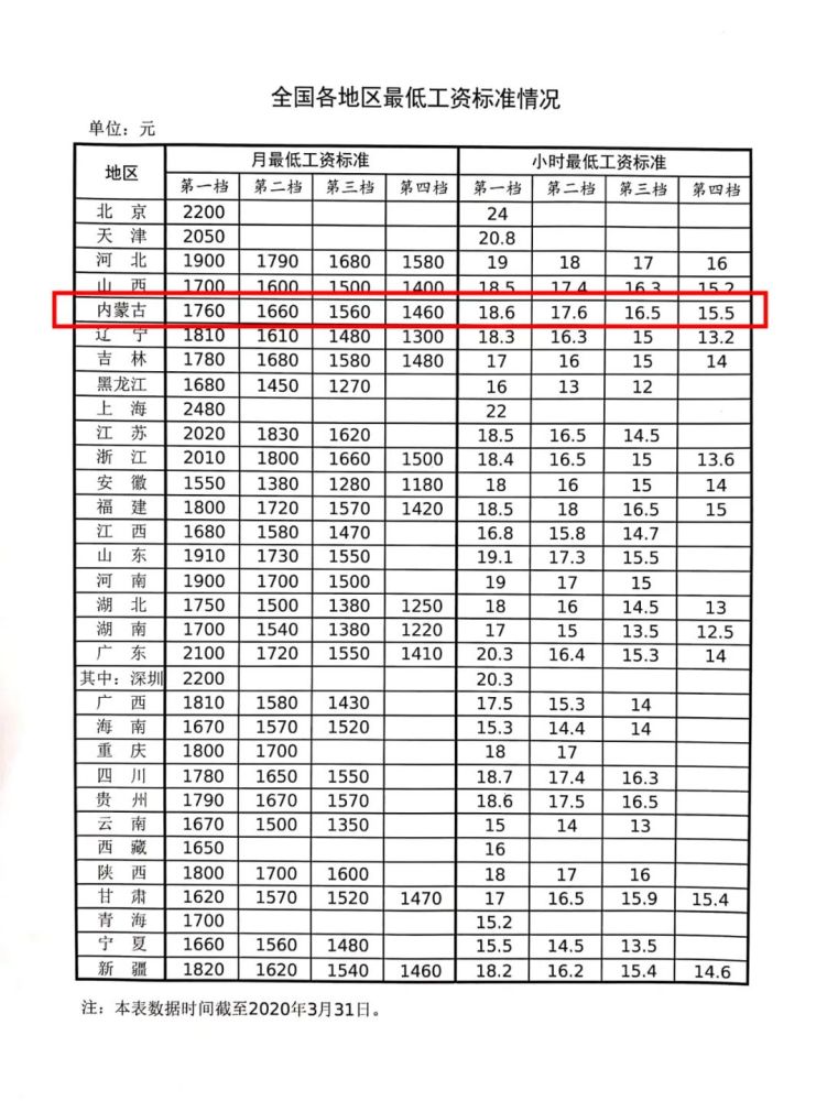 全国最低工资标准 内蒙古最低工资标准发布