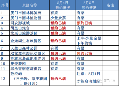 截止5月3日上午10点,5月4日鼓浪屿(日光岩、菽庄花园、皓月园)、同安影视城、胡里山炮台、北辰山旅游景区、金光湖生态旅游区、双龙潭生态运动景区、英雄三岛战地观光园等景区预约已满,厦门市园林植物园还有少量余票。市民和游客还可预约厦门市园林博览苑、天竺山森林公园、集美鳌园、海沧青礁慈济祖宫等景区门票。
