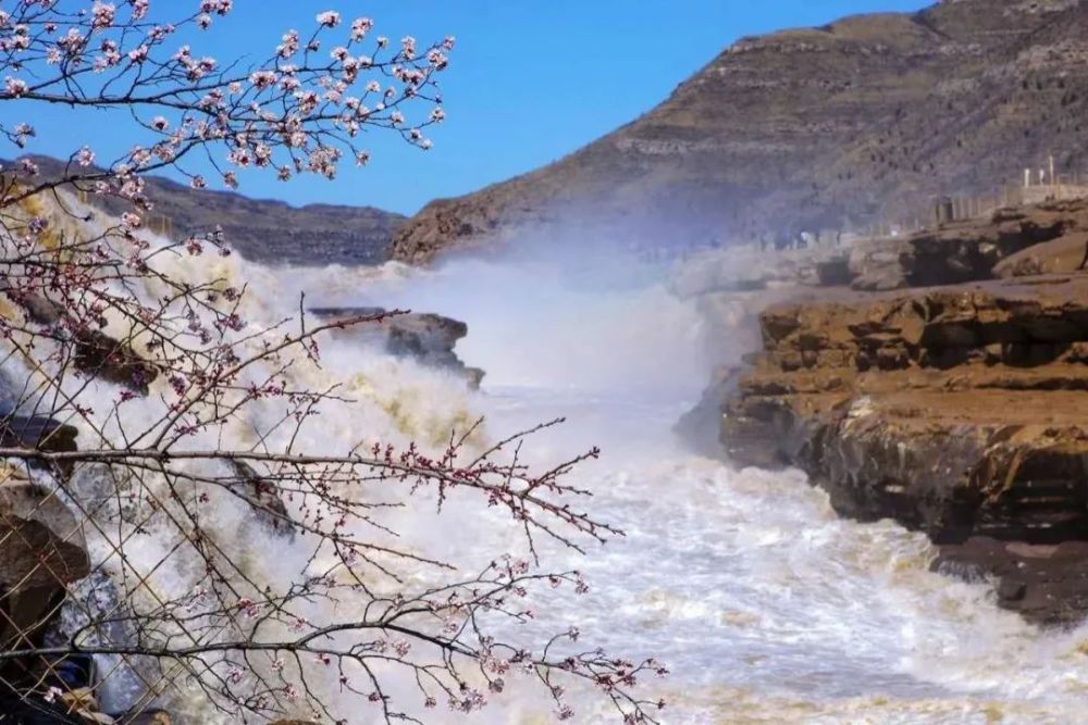 三月,两岸山桃花盛开,与壮观的瀑布相映成趣。
