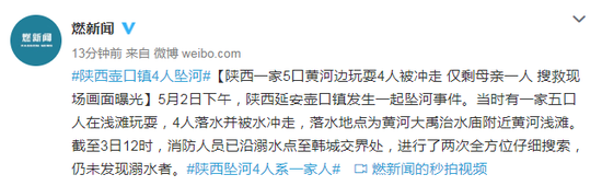 原标题:陕西一家5口黄河边玩耍4人被冲走 仅剩母亲一人 搜救现场画面曝光