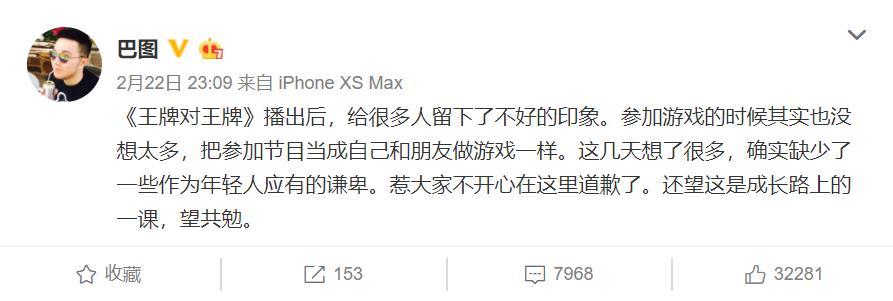 但即便这样,网友依旧找到了“茬点”,认为巴图在节目中的表现,比如“搭手”张铁林、显得很没有礼貌;再加上节目中宋丹丹不断的称赞巴图,“我儿子太棒了”,让观众越发觉得这“两母子”太作了。最终,巴图不得不在微博上,解释了一番自己的行为。