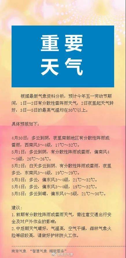 扬子晚报网4月29日讯(记者 于丹丹)刚刚,南京气象发布重要天气,明天最高32℃!今年这个五一假期将热到飞起!