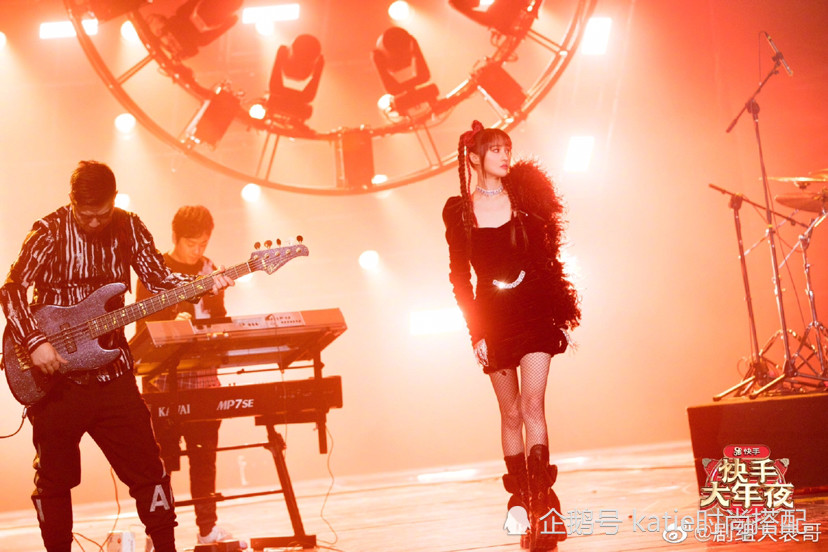 郑爽大年夜穿搭造型,身着羽毛饰黑色丝绒裙与渔网装,尝试与以往不同的暗黑萝莉风。