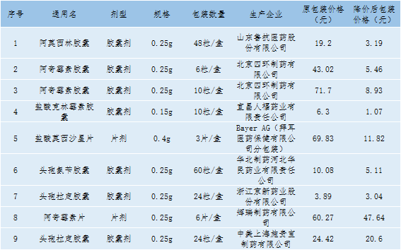 一些常用的抗生素如阿莫西林胶囊由0.4元/粒降到0.08元/粒、阿奇霉素胶囊由7.17元/粒降到0.91元/粒,降幅均达到80%以上。拜耳医药保健的盐酸莫西沙星片(0.4g*3片/盒)由69.83元/盒降到11.82元/盒,降幅达83%。