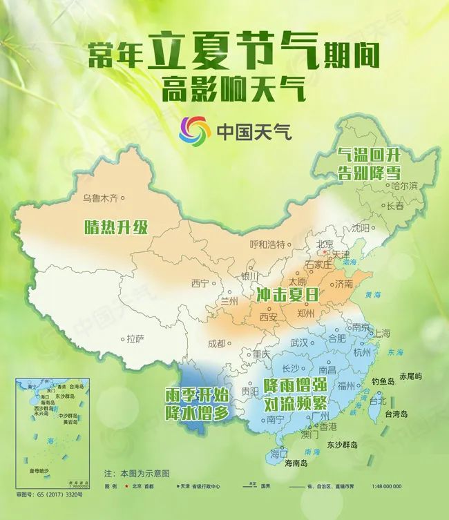 在天文学上,立夏表示告别春天,是夏天的开始。人们习惯上都把立夏当作是温度明显升高,炎暑将临,雷雨增多,农作物进入旺季生长的一个重要节气。但如果按照日平均气温连续5天保持在22℃或以上的气象学标准,此时我市还处在暮春时节