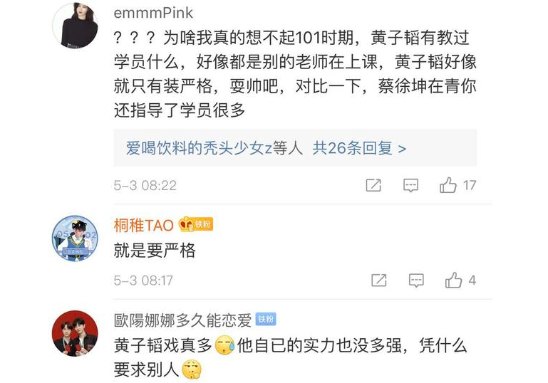 有不少人称,黄子韬像是吃错药了,从创1到创3,很双标,说实话他点评不出什么,每次都是其他导师点评的差不多,再更一句,有带自己情绪,严厉不代表凶,他实在不会说话,他应该向蔡徐坤学学,说话有时要幽默,本来就是比赛,大家肯定会紧张,结果一下子把选手搞得都神经兮兮的,怎么能发挥最佳的水平呢