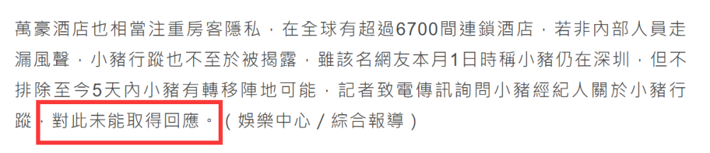 加上该豪华酒店十分注重客人隐私,在全球有超过6700间连锁酒店。如若不是有知情人透露,罗志祥的行踪也不会被公之于众。不过距离罗志祥被扒在某知名酒店入住已有5天,他有可能在这5天里已经转移阵地。对此,有媒体记者致电罗志祥经纪人想要获得一手资料,不过对方仍没有接听电话,处于“失踪”状态,更令外界感觉罗志祥如今面临重重危机,不敢轻举妄动。